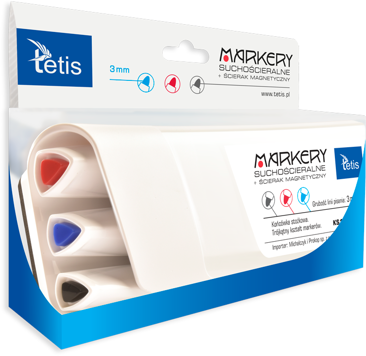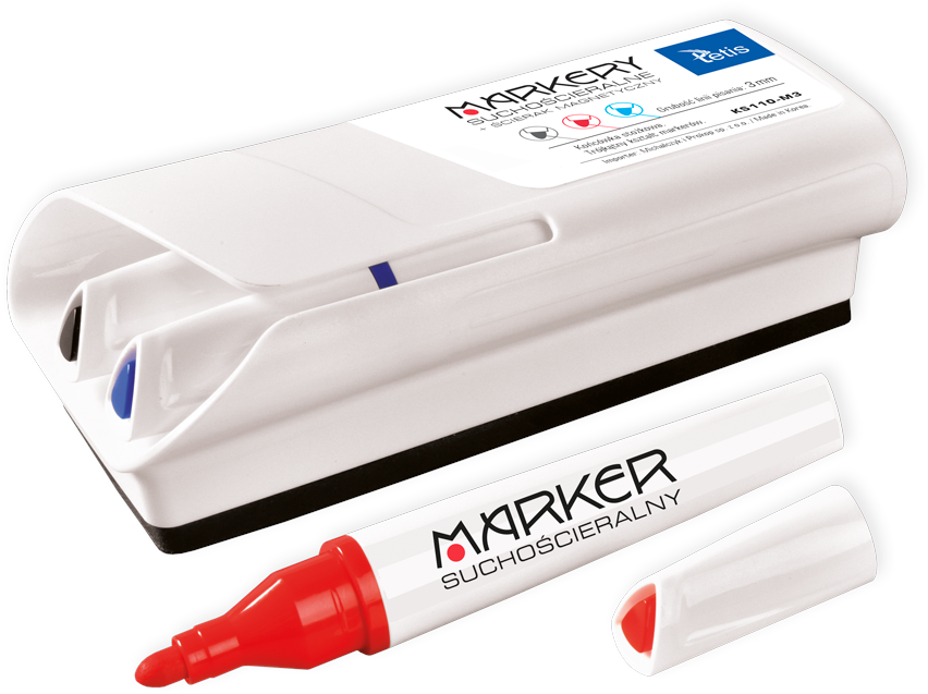 - Komplet 3 markerów suchościeralnych (czarny, czerwony, niebieski) ze ścierakiem magnetycznym.