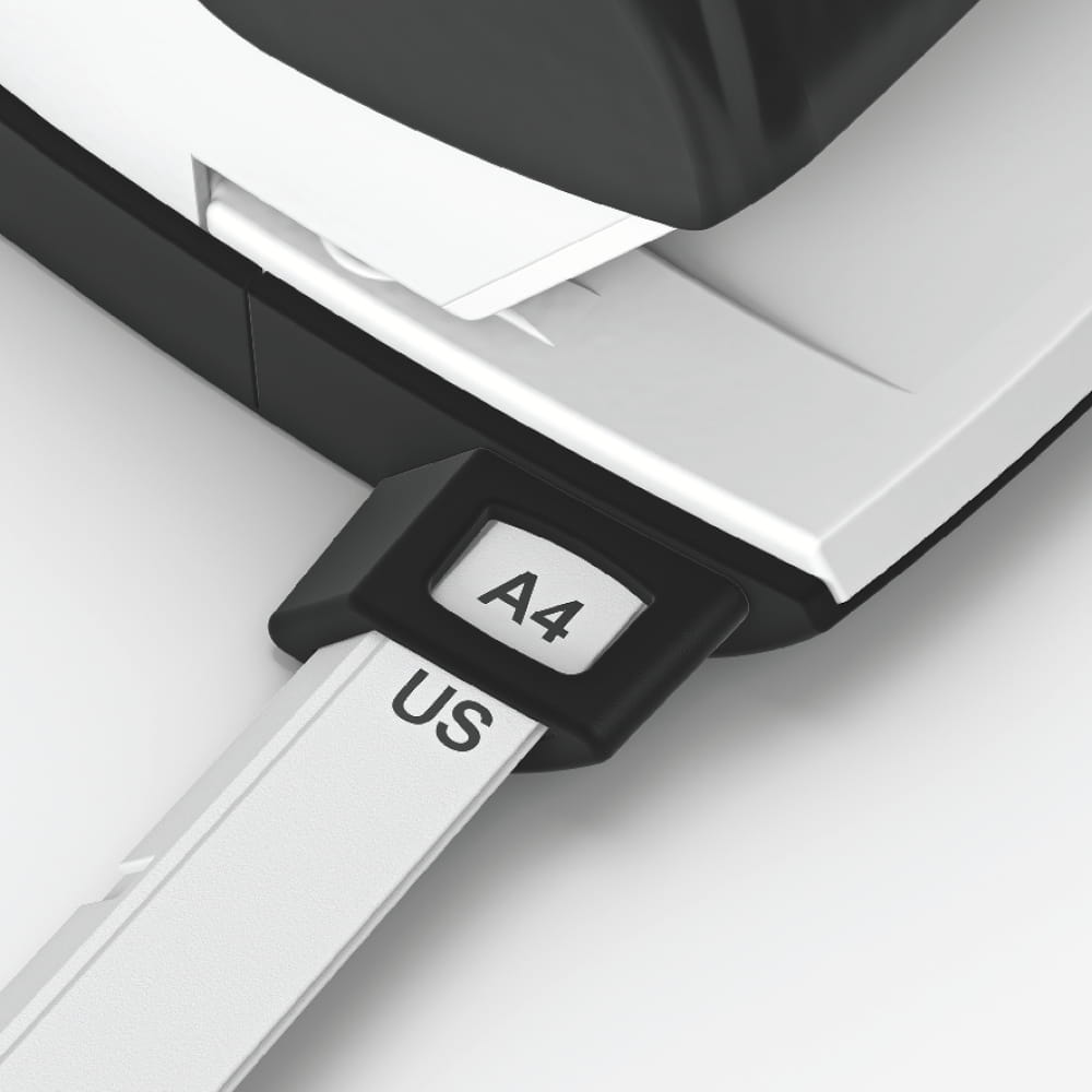 - Wyraźne oznaczenia formatu i wytrzymała prowadnica zapewniają doskonałe wyrównanie papieru