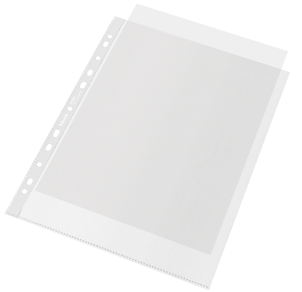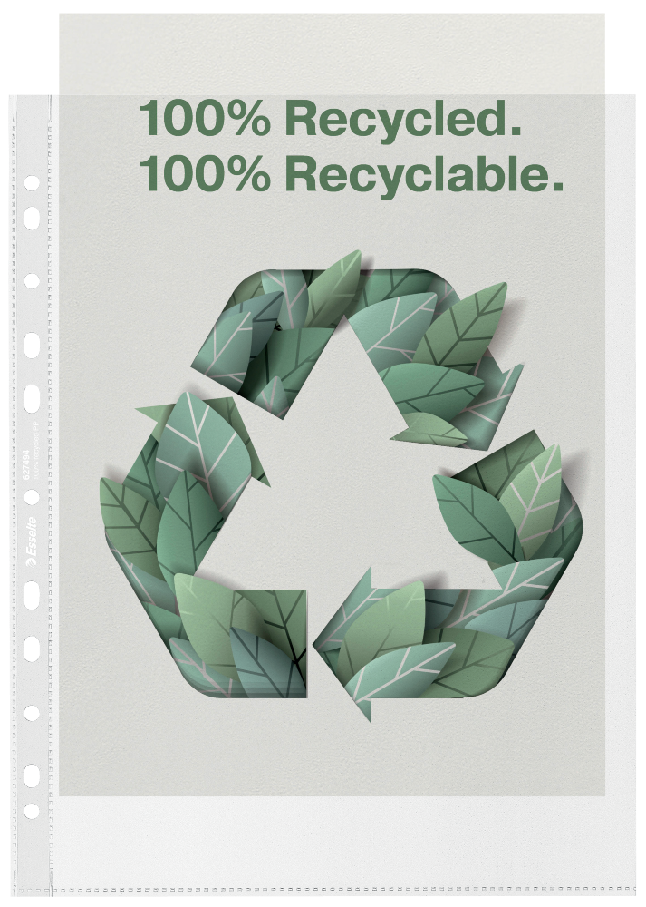 Ekologiczne koszulki na dokumenty w formacie A4 MAXI, do codziennego użytku, wykonane z mocnego polipropylenu pochodzącego w 100% z tworzywa sztucznego pochodzącego z recyklingu (skrawki/odpady przemysłowe lub pozostałości poprodukcyjne; testowane zewnętrznie przez UL). Z perforowanym paskiem umożliwiającym wygodne przechowywanie w segregatorach z mechanizmem dźwigniowym oraz ringowych. Mieszczą do 80 kartek A4, więcej niż standardowe koszulki na dokumenty. Mogą być wielokrotnie używane, w całości nadają się do recyklingu. Opakowanie wykonane jest z kartonu, który również w 100% pochodzi z recyklingu i nadaje się do ponownego przetworzenia. Wyprodukowane w Europie.