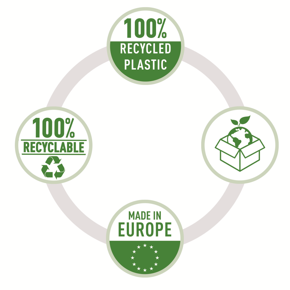 - Wykonany w 100% z nietoksycznego tworzywa sztucznego (PP) pochodzącego z recyklingu. Cały produkt w 100% podlega recyklingowi.