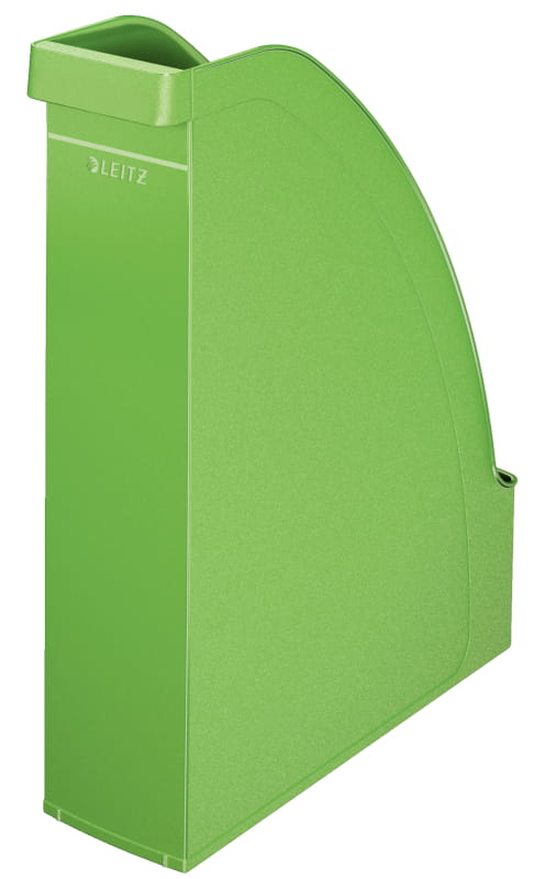 Najwyższej jakości pojemnik na czasopisma. Wzornictwo i kolorystyka spójna z linią produktów na biurko Leitz Plus.