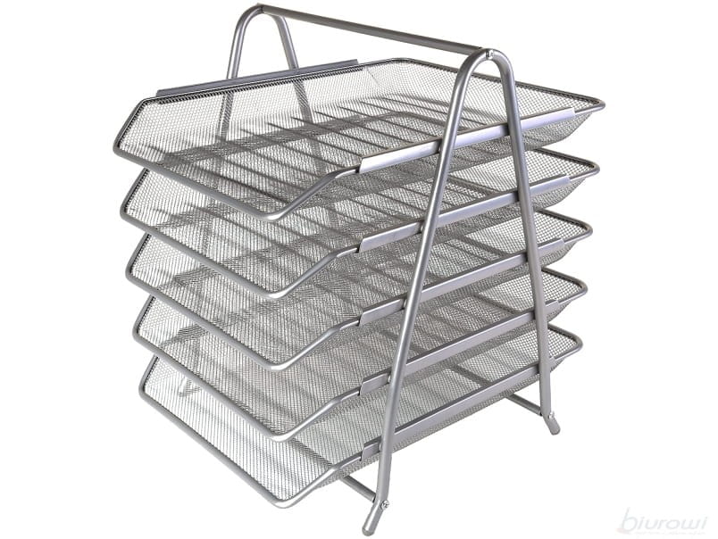 - Pięciopoziomowa półka na dokumenty, wykonana z metalowej siatki pokrytej lakierem.