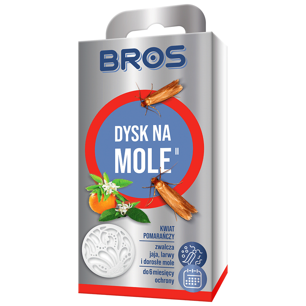 BROS Dysk na mole to skuteczny środek do walki z molami odzieżowymi we wszystkich stadiach ich rozwoju – jaja, larwy i dorosłe osobniki. Produkt idealnie sprawdza się w szafach, szufladach, garderobach i innych miejscach przechowywania ubrań.