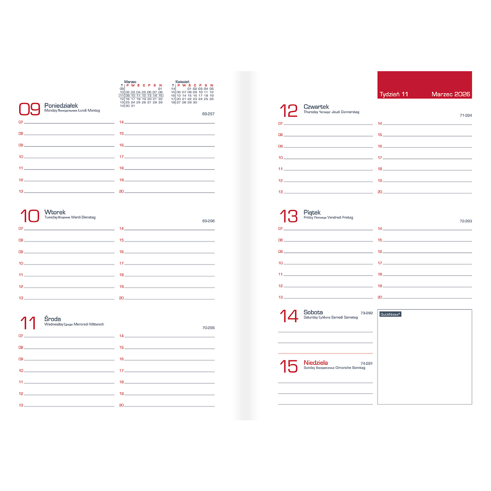 - Układ: tydzień na dwóch stronach