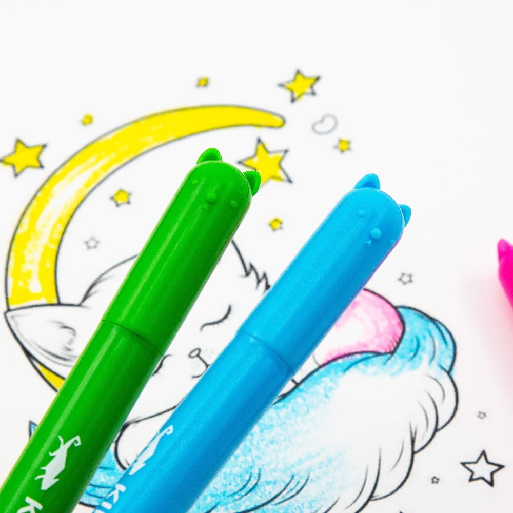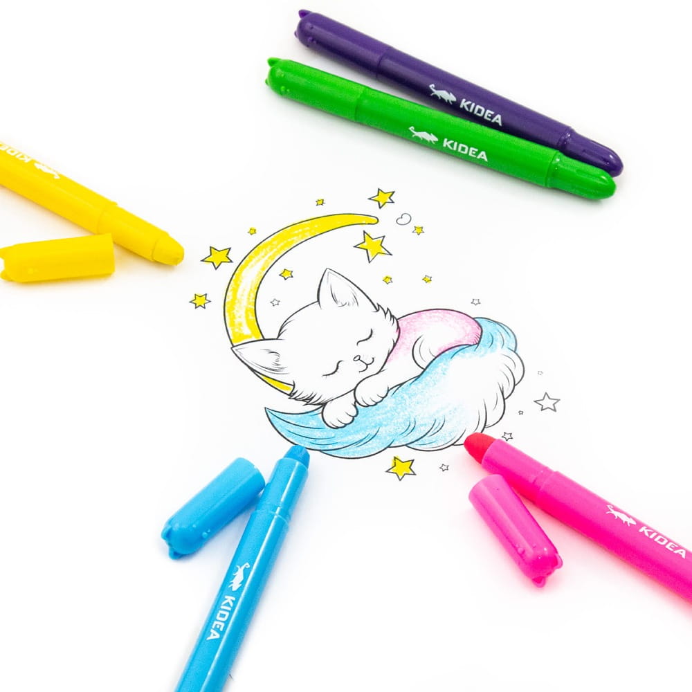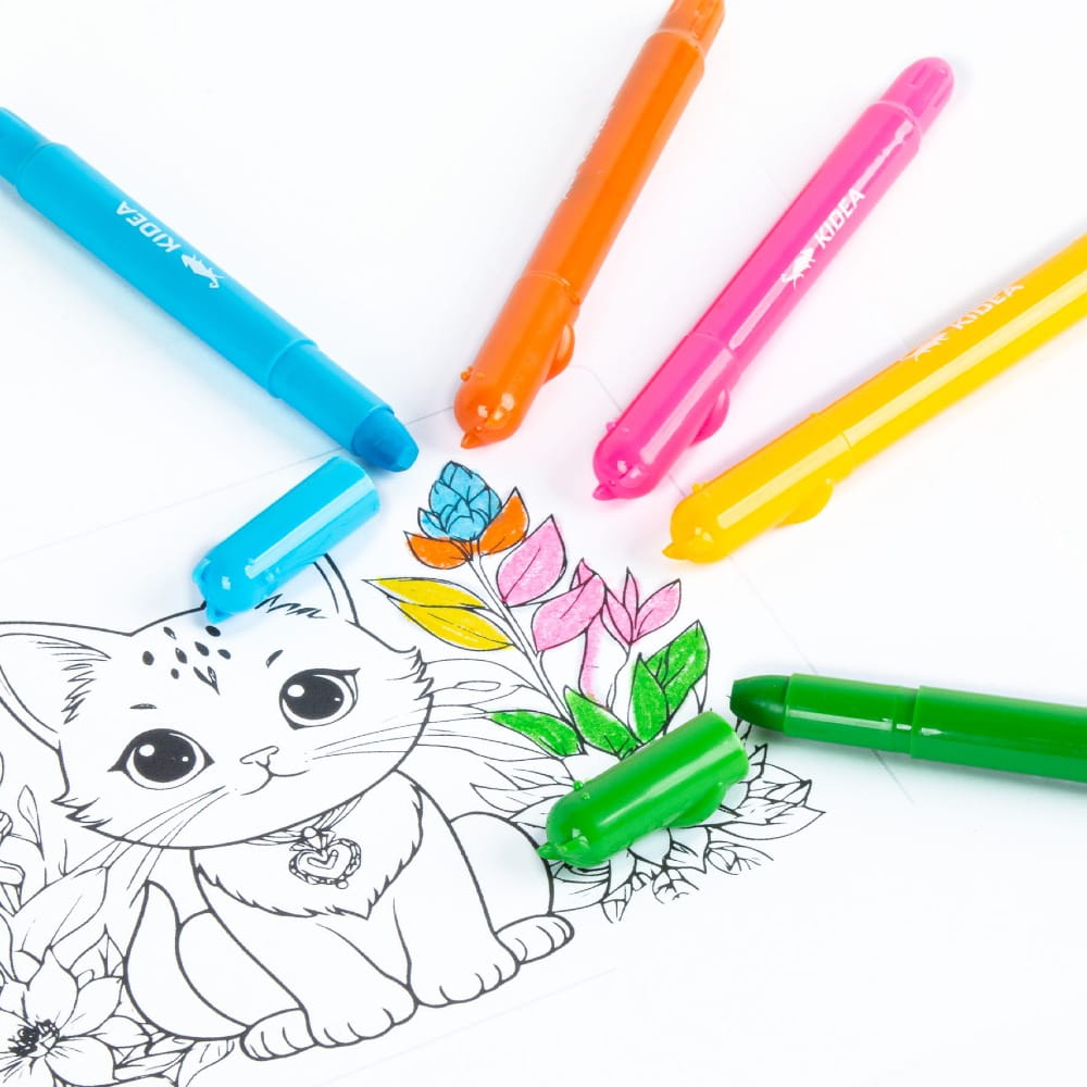 Kredki żelowe ze słodkimi kotkami na końcówce. Dzięki swojej żelowej formule rysowanie nimi jest gładkie i przyjemne.