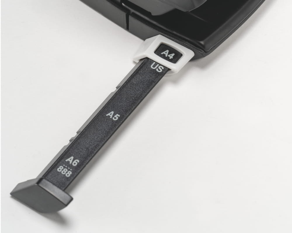 - Wyraźne oznaczenia formatu i wytrzymała prowadnica zapewniają doskonałe wyrównanie papieru.