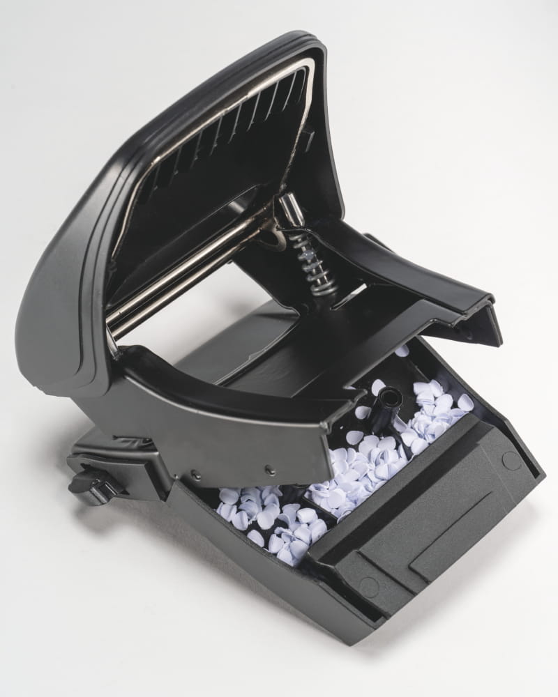 - Dziurkacz posiada łatwy do opróżniania pojemnik na ścinki zamontowany na zawiasach.
