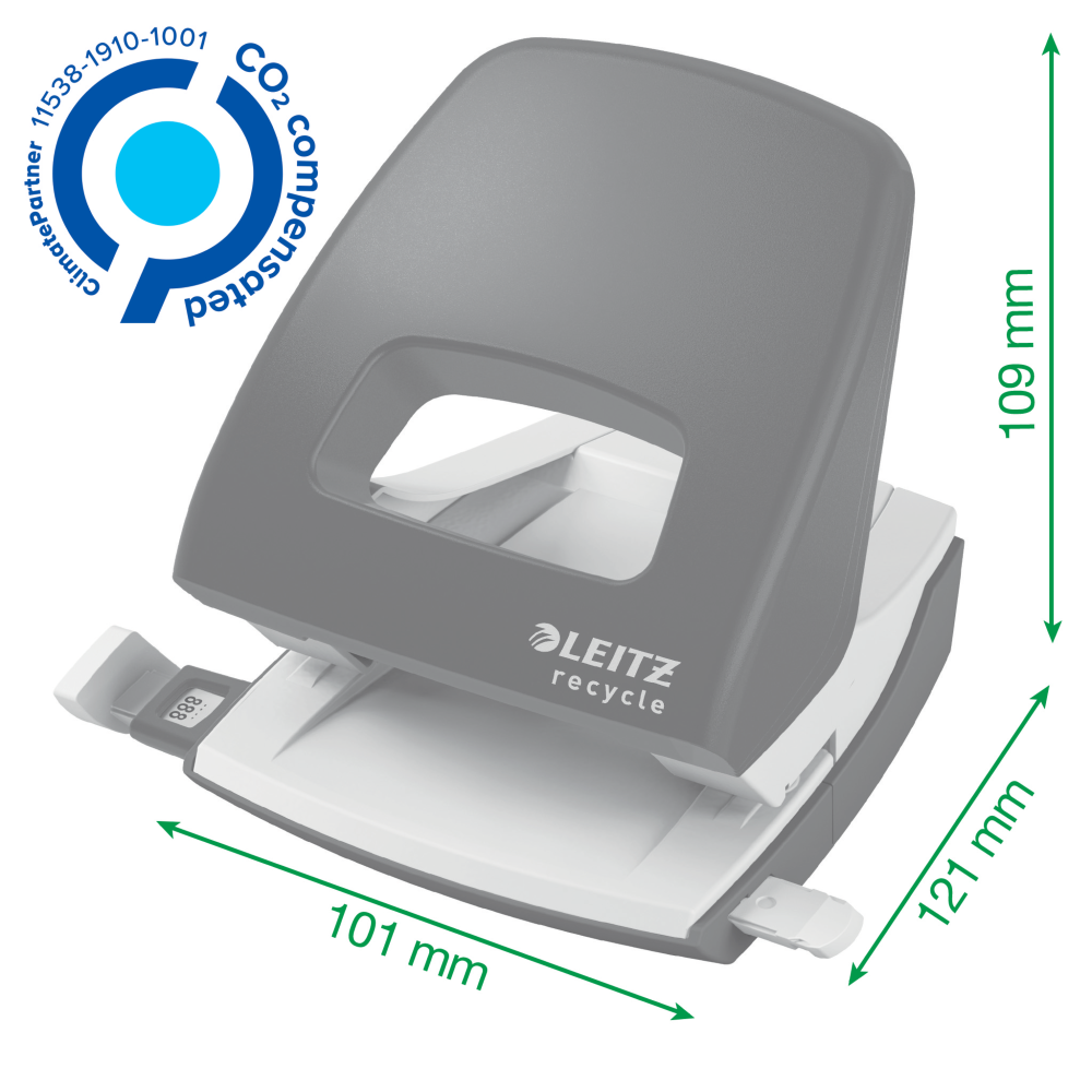 Opatentowana, łatwo poddająca się naciskowi strefa uchwytu i doskonałe ostrza pozwalają zmniejszyć wysiłek podczas dziurkowania. Ten solidny i niezawodny dziurkacz zapewnia użytkowanie przez długie lata i doskonale pasuje do innych produktów z kolekcji Leitz Recycle. Kolekcja nowoczesnych, przyjaznych dla środowiska artykułów biurowych świetnie zaprezentuje się w domu i w biurze.