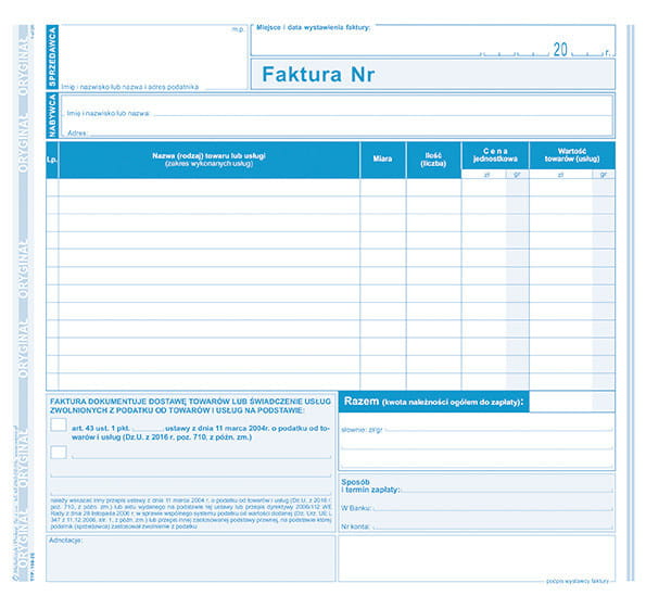 - Czynności zwolnione z podatku na podst. art. 43 ust. 1 pkt 2-41 z dn. 11 marca 2004r
