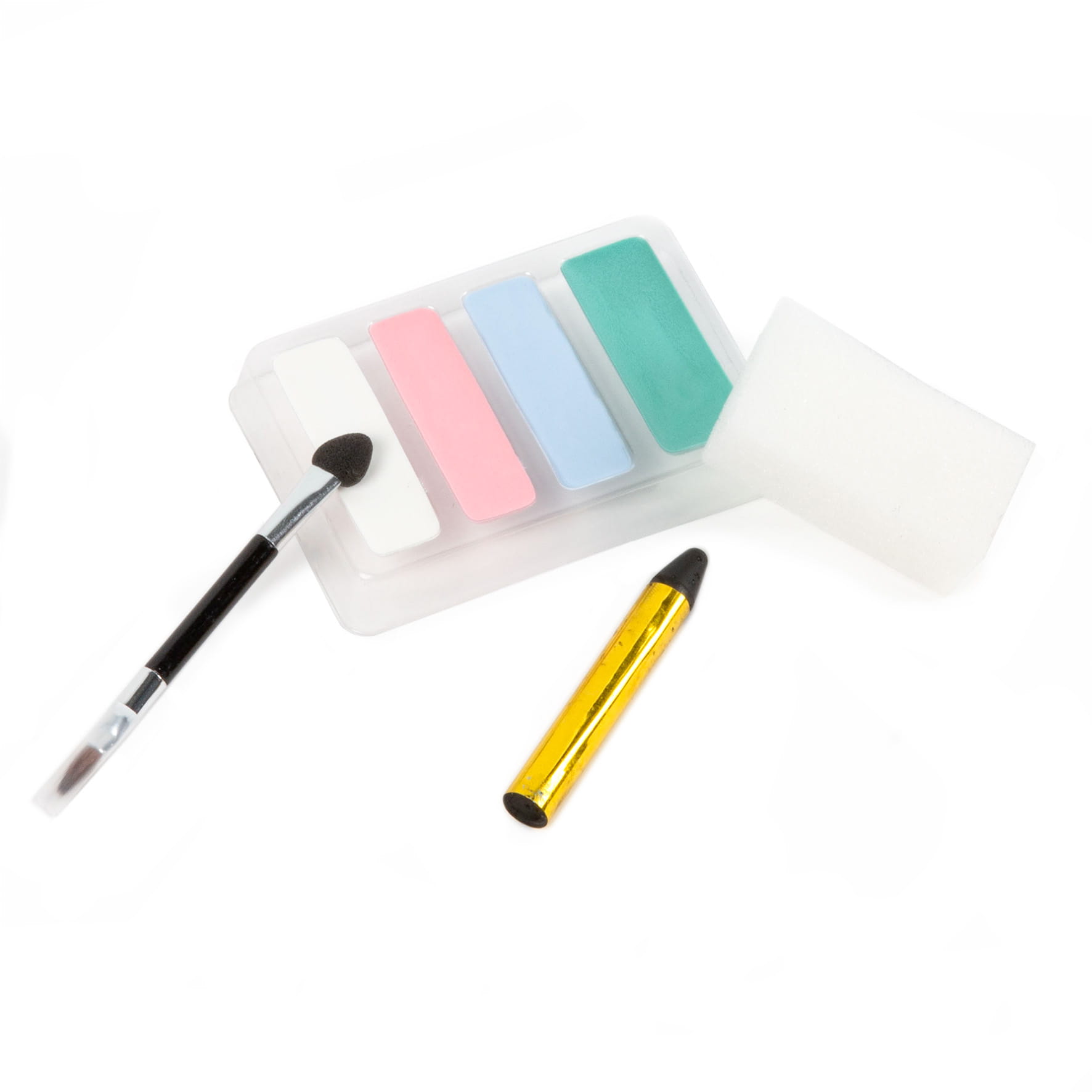 - W zestawie Księżniczka znajdują się 4 pastelowe farbki, którymi bezpiecznie można malować po skórze, czarna kredka, gąbeczka, dwustronny aplikator oraz naklejki do ciała.