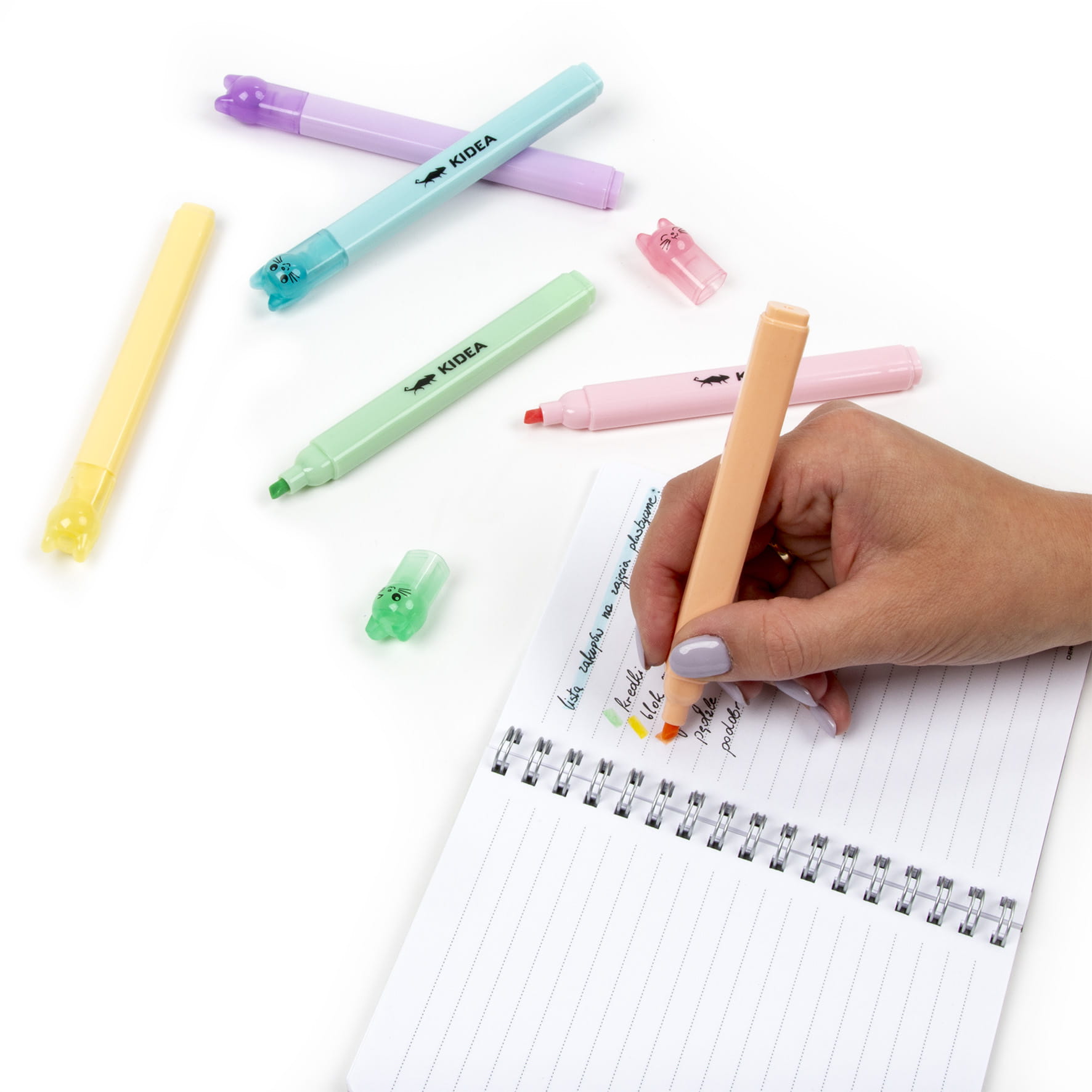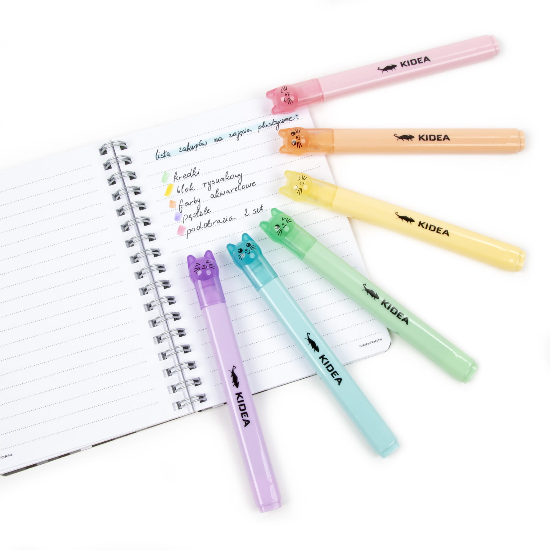 - Flamastry pastelowe Kidea z zatyczkami w kształcie kotków w 6 kolorach: zielonym, żółtym, brzoskwiniowym, różowym, fioletowym i niebieskim.