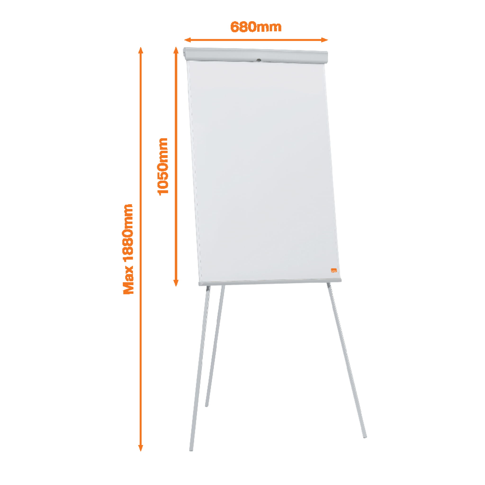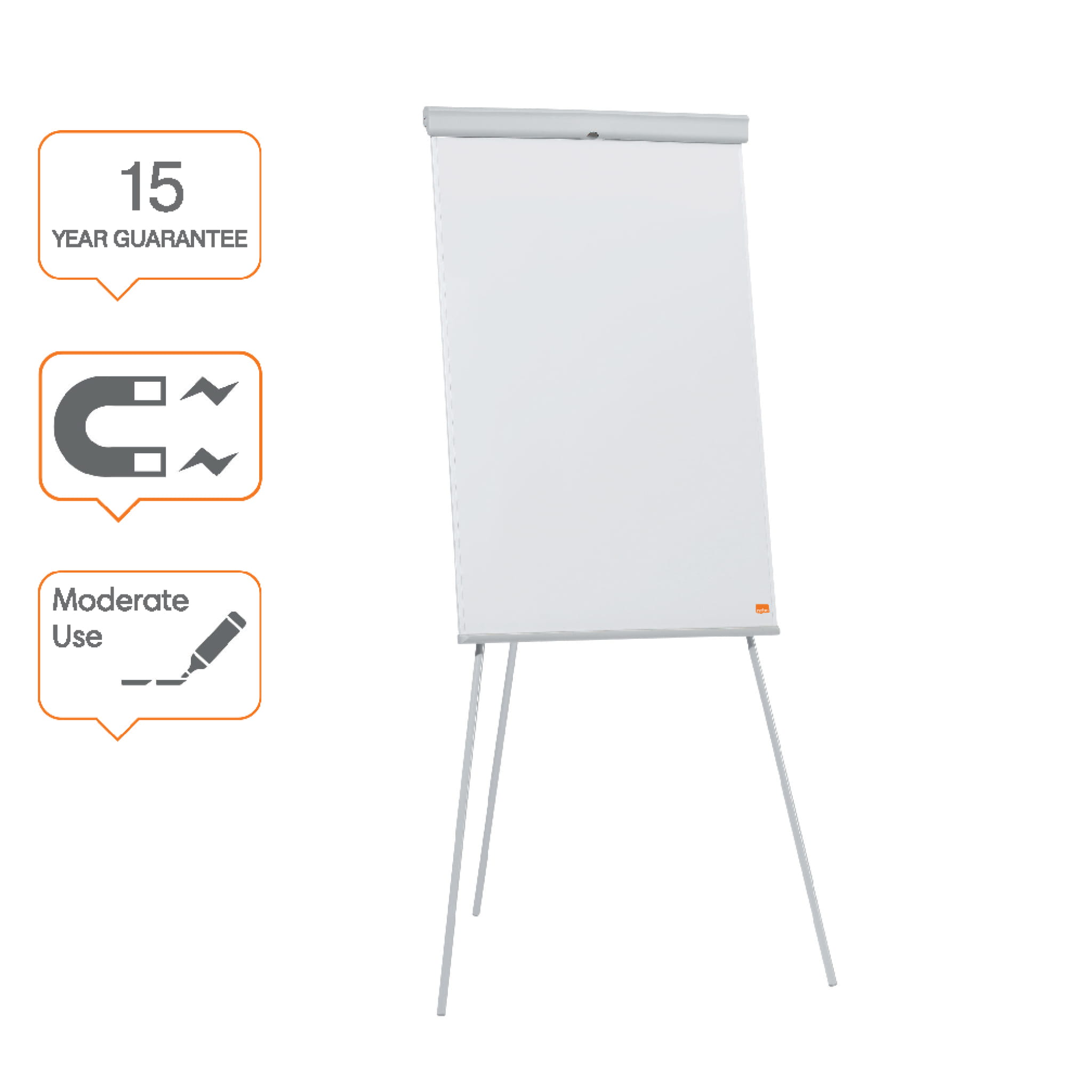 Flipchart ze stalową magnetyczną tablicą suchościeralną umieszczony na trójnożnym statywie, wyposażony w zintegrowaną półkę na markery. Nogi statywu mają regulowaną wysokość do 188 cm i są w pełni chowane na czas przechowywania lub przenoszenia. W komplecie haczyki do bloków Nobo oraz listwa ułatwiająca odrywanie kartek z zawieszonego bloku. Stalowa magnetyczna powierzchnia tablicy zapewnia wysoki poziom ścieralności przy umiarkowanym użytkowaniu.