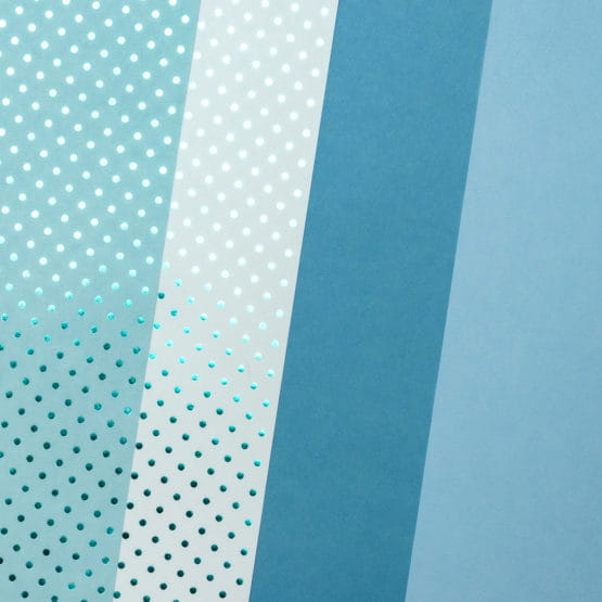 - W zestawie 6 kartonów z metalicznymi niebieskimi kropkami 190g/m2 i 6 kartonów gładki w dwóch odcieniach niebieskiego 210g/m2