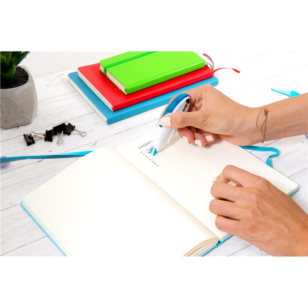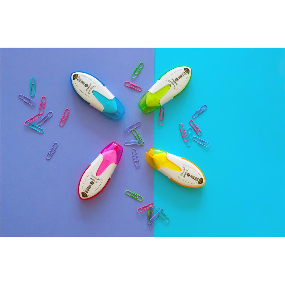 - Posiada zatyczkę, zapobiegającą wysychaniu taśmy korekcyjnej i uszkodzeniu podajnika.