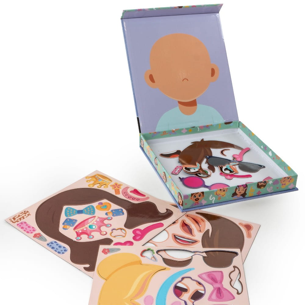 Dzieci mogą tworzyć zabawne twarze, łączyć fryzury, oczy, usta, spinki, kolczyki i inne dodatki, odtwarzać wzory z opakowania lub projektować własne, niepowtarzalne stylizacje.