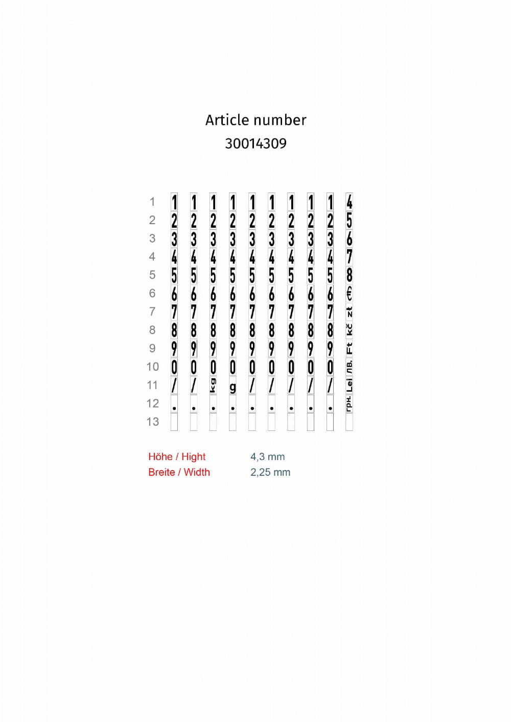 - Siedem symboli walut (zł, грн., Lei, Лв, Ft, Kč, €) i znaki wagi (kg, g)
