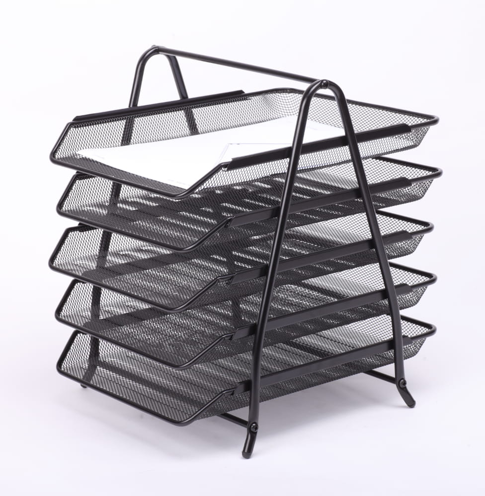 - Pięciopoziomowa półka na dokumenty, wykonana z metalowej siatki pokrytej lakierem.