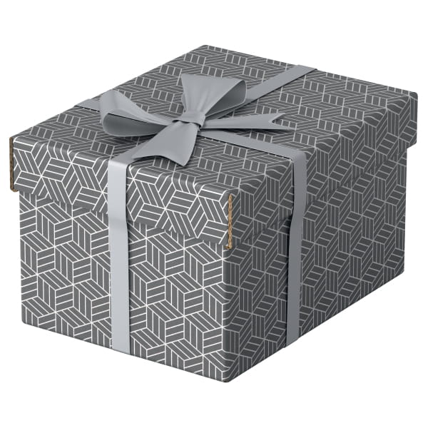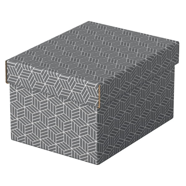 Zestaw trzech nowoczesnych i stylowych tekturowych pudełek ze zdejmowaną pokrywą, idealnych do zapakowania prezentów lub szybkiego wykreowania w domu nowego miejsca do przechowywania. Można je używać oddzielnie lub ustawiać na półkach i regałach, aby mniejsze rzeczy, takie jak zdjęcia czy dokumenty osobiste były przechowywane w uporządkowany i łatwy do znalezienia sposób. Dodaj wstążkę i zapakuj prezent! Po wyjęciu prezentu obdarowany może wykorzystać pudełko do przechowywania różnych rzeczy, dzięki czemu otrzyma 2 prezenty w jednym. Wykonane z mocnej tektury falistej, w 100% pochodzącej z recyklingu i w 100% nadającej się do ponownego przetworzenia, opatrzonej certyfikatem FSC. Mają gładką, łatwą do czyszczenia powierzchnię z dwukolorowym, geometrycznym wzorem, dopełniającym styl wnętrza. Pudełka są dostarczane na płasko, do samodzielnego złożenia, a ich montaż jest szybki i łatwy. Po złożeniu boki pudełka tworzą podwójne ścianki, dzięki czemu pudełka są mocne i dobrze chronią zawartość. Wszystkie mają ten sam rozmiar.