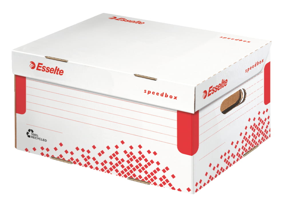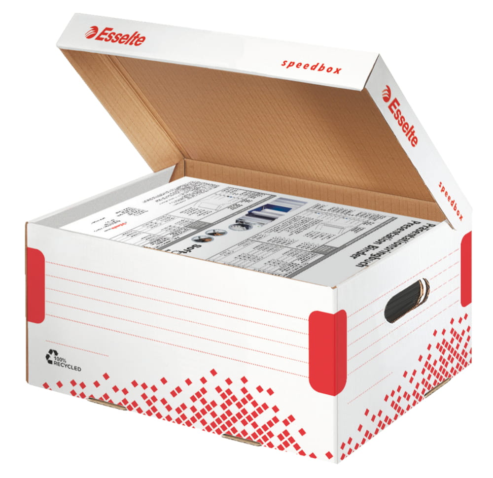 Pudło archiwizacyjne Esselte Speedbox to rozwiązanie dla osób poszukujących trwałego i ekologicznego sposobu przechowywania dokumentów. Wykonane z kartonu w 100% pochodzącego z recyklingu i w 100% nadającego się do ponownego przetworzenia, posiadają certyfikat FSC®.
