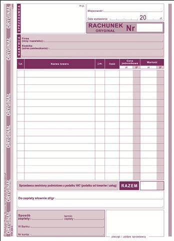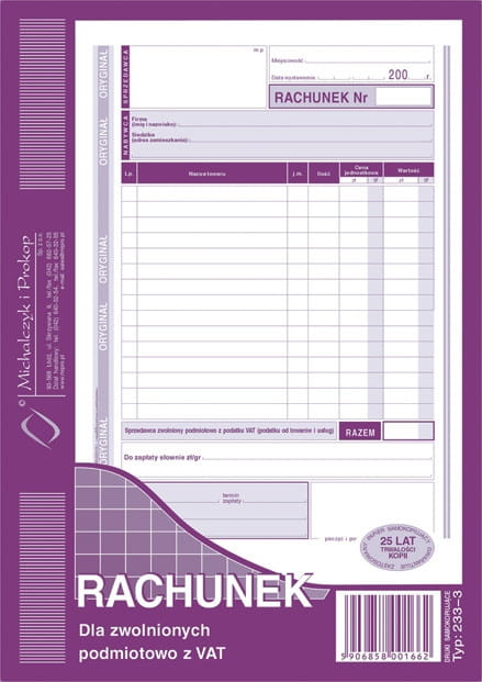 Rachunek dla zwolnionych podmiotowo z VAT, pion, /233-3