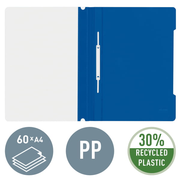 Skoroszyt plastikowy Leitz A-4, w 30% z przedużytkowego tworzywa z odzysku, niebieski