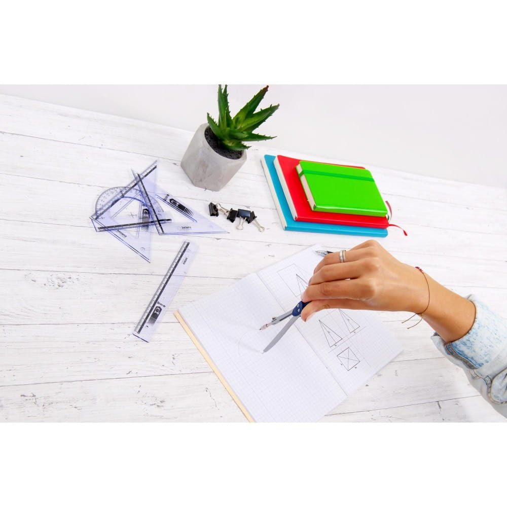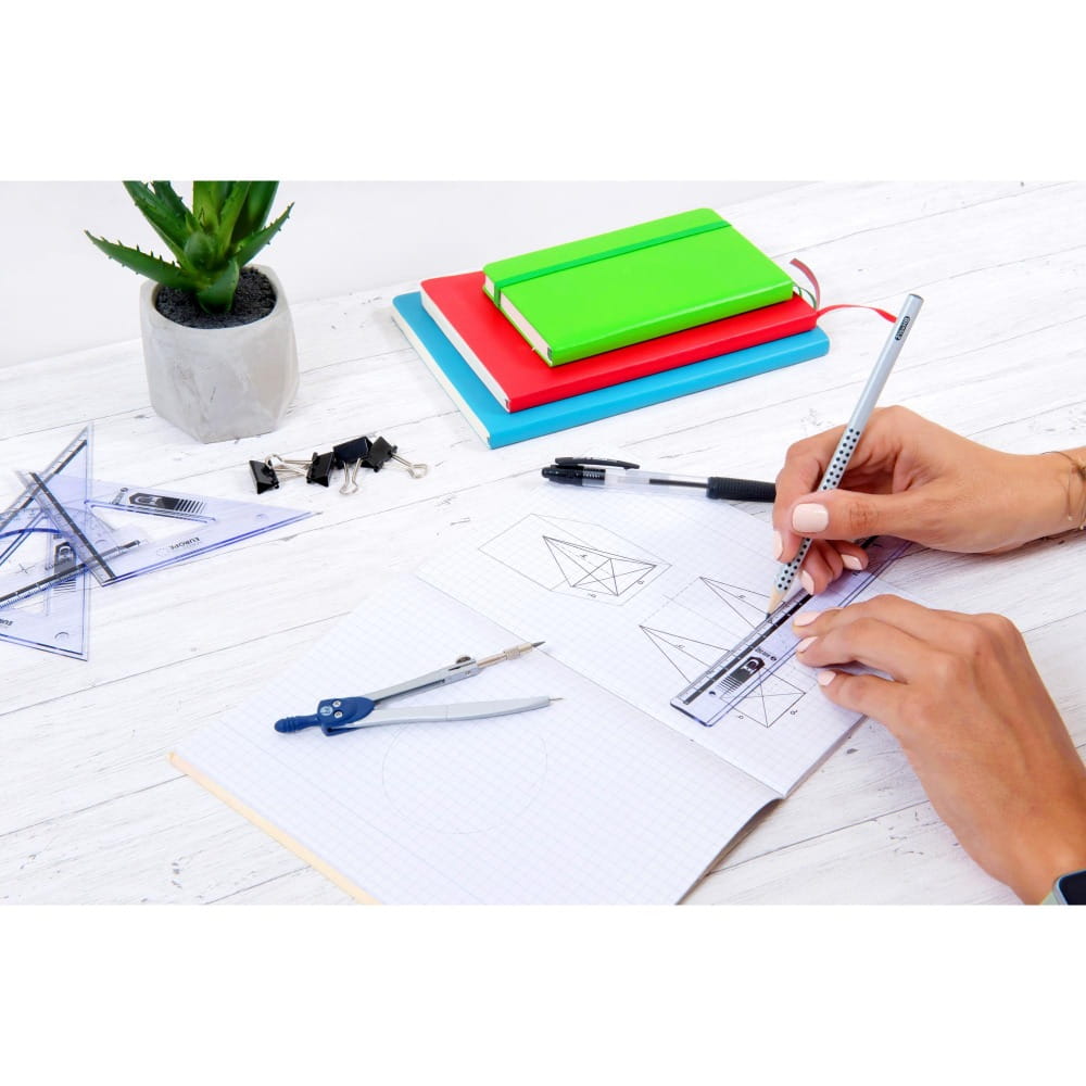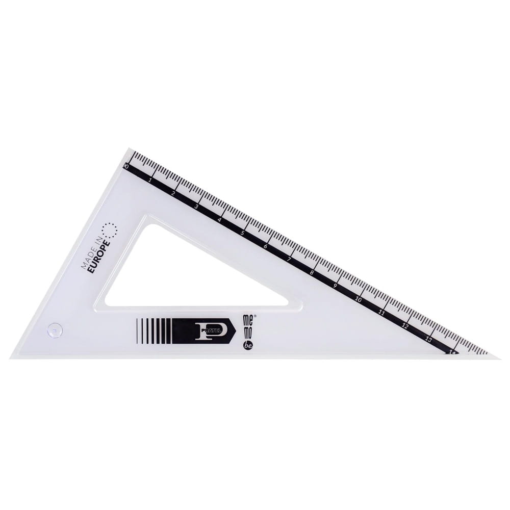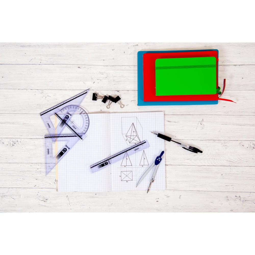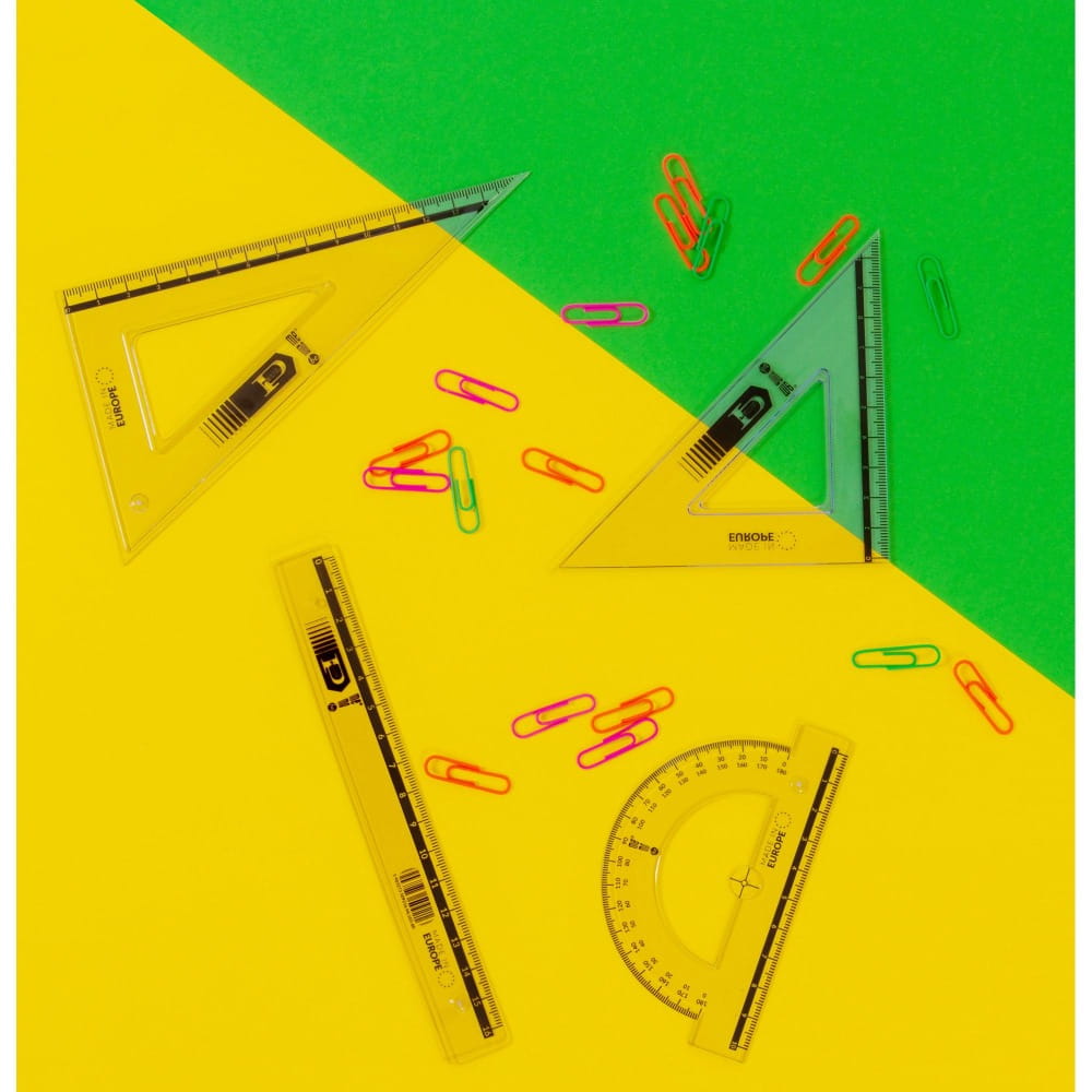 - W każdym zestawie 2 standardowe przezroczyste ekierki 16 cm 45/60 stopni, kątomierz 10 cm/180 stopni oraz linijka 20 cm.
