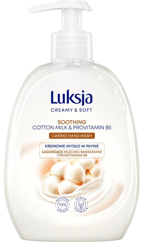 - Kremowe mydło w płynie Luksja Mleczko bawełniane i Prowitamina B5 łagodnie oczyszcza i pielęgnuje dłonie podczas każdego mycia.