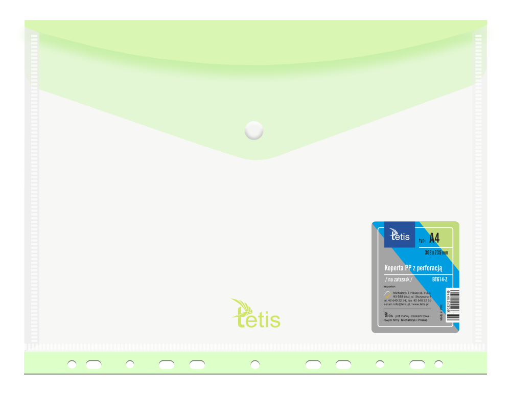 Teczka kopertowa na zatrzask Tetis z europerforacją A-4, jasnozielona