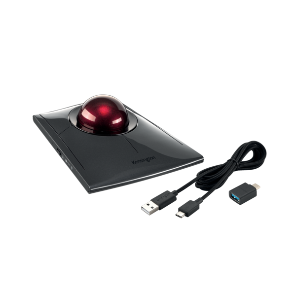 - Zawiera bezprzewodowy klucz sprzętowy 2,4 GHz (USB-A z adapterem USB-C na USB-A) i 1,5-metrowy kabel ładujący USB-C na USB-A (port USB-C na trackballu).